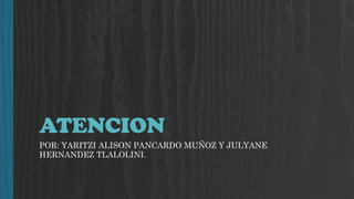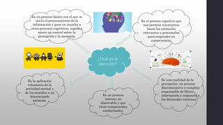 Este documento define la atención como un proceso cognitivo interno que nos permite procesar información relevante y responder a estímulos. Explica que existen diferentes tipos de atención como la sostenida, dividida y alterna. Además, detalla cómo la atención interactúa con procesos como la percepción, emoción e inteligencia. Finalmente, identifica factores que influyen en la atención y estrategias para mejorarla.