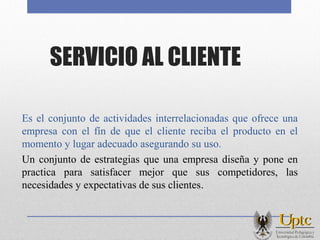 El documento describe los conceptos clave de servicio al cliente, incluyendo su definición, importancia, estrategias y elementos. El servicio al cliente es el conjunto de actividades que una empresa realiza para asegurar que el cliente reciba el producto de manera adecuada. Un buen servicio al cliente es fundamental para fidelizar a los clientes y generar ventaja competitiva. Los elementos clave del servicio al cliente son el cliente, el personal de contacto, el soporte físico y la exhibición.