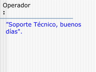 Este documento es una transcripción de una conversación entre un usuario de soporte técnico y un operador que está teniendo problemas para acceder a la red. A lo largo de la conversación, el operador demuestra una falta de conocimiento básico sobre conceptos como nombre de usuario, contraseña y dominio. El usuario de soporte se frustra cada vez más a medida que intenta explicarle al operador cómo resolver el problema, pero el operador no parece entender o seguir las instrucciones. Finalmente, el operador dice que encontró una nota adhesiva con su nombre de usuario, contraseña y