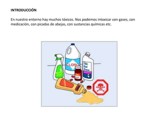 Este documento proporciona información sobre el tratamiento de pacientes intoxicados. Resume las principales vías de entrada de tóxicos en el cuerpo, los síntomas iniciales más comunes de intoxicación y los enfoques de tratamiento para diferentes tipos de intoxicaciones, incluidas las causadas por ingesta de productos no cáusticos, cáusticos, metanol, contacto dérmico y gases.