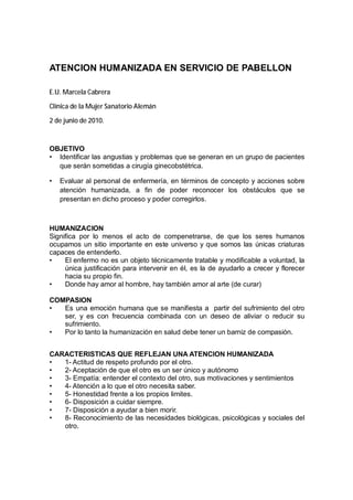 Este documento describe los objetivos y características de una atención humanizada en el servicio de pabellón de una clínica de la mujer. Explica que la humanización significa comprender que los seres humanos somos únicos y capaces de entender el universo. También describe las angustias comunes que enfrentan las pacientes según el tipo de cirugía y las tareas del personal de enfermería para brindar una atención compasiva y centrada en el paciente. Finalmente, identifica obstáculos a la humanización y formas de mejorar