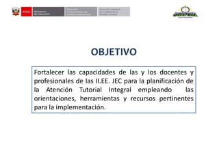 Este documento proporciona orientaciones sobre la Atención Tutorial Integral (ATI) en instituciones educativas. La ATI busca acompañar a los estudiantes en sus necesidades socioemocionales y cognitivas para promover la construcción de su proyecto de vida a través de un clima escolar de confianza. Se implementará a través de la tutoría grupal y la tutoría individual con un enfoque de derechos humanos, desarrollo humano y bienestar. Abordará tres dimensiones: desarrollo personal, aprendizajes y desarrollo