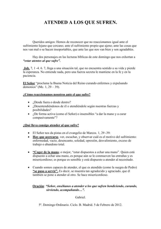 El documento habla sobre la importancia de atender a los que sufren. Cita dos personajes bíblicos, Job y Jesús, que exhortan a estar atentos al que sufre. Pregunta cómo reaccionamos ante el sufrimiento ajeno y ofrece consejos sobre cómo atender mejor a los que sufren: acercarse para escucharlos, observar la causa de su sufrimiento y estar dispuestos a echar una mano. Cuando se les atiende, los que sufren se muestran agradecidos y también se ponen a atender a los demás.