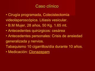 Este documento presenta un caso clínico de una paciente que experimentó un estado parcial de inconsciencia durante una cirugía. La paciente recibió una anestesia total intravenosa con midazolam y despertó con memoria explícita del procedimiento quirúrgico. El documento luego discute los estadios de inconsciencia, las causas y factores de riesgo del estado de conciencia parcial, y las posibles consecuencias de este evento.