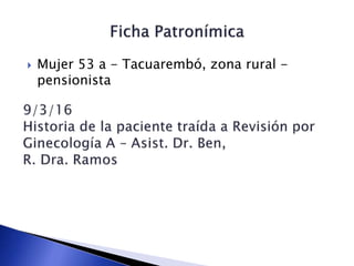 Este documento describe el caso de una paciente de 53 años con un tumor de ovario derecho de 15 cm. La biopsia del tumor indicó un teratoma ovárico maligno del tipo estruma ovaria, con predominio de tejido tiroideo. La paciente fue sometida a histerectomía, ooforectomía y omentectomía. El análisis microscópico reveló un estruma ovaria variante folicular, con invasión vascular. Se diagnosticó hipotiroidismo y se inició tratamiento.
