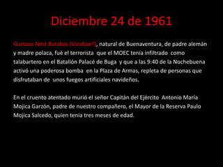Un atentado terrorista ocurrió en el Batallón Palace de Buga el 24 de diciembre de 1961, cuando una bomba explotó en la plaza de armas repleta de personas durante los fuegos artificiales navideños. El capitán del ejército Antonio María Mojica Garzón murió en la explosión. El atentado fue llevado a cabo por Gustavo Nest Barabas, un terrorista infiltrado en el batallón por el Movimiento Obrero Estudiantil Campesino 7 de enero (MOEC), un grupo de izquierda