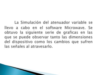 Este documento describe un atenuador variable simple para guía de onda rectangular. Consiste en una lamina resistiva paralela insertada en la cara ancha de la guía. La lamina suele tener forma de cuna o escalonada para minimizar reflexiones. Se construye de un material dieléctrico recubierto de grafito. El documento incluye gráficas que muestran cómo el atenuador reduce la potencia de la señal de entrada a medida que gira el tornillo micrométrico.