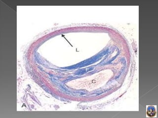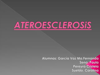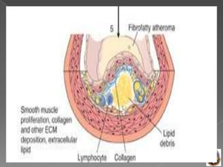 La ateroesclerosis se caracteriza por la formación de ateromas en las arterias, compuestos por colesterol, células espumosas y tejido fibroso. Los principales factores de riesgo son la hiperlipidemia, hipertensión, diabetes y tabaquismo. Si la placa se rompe, puede obstruir el flujo sanguíneo y causar eventos como infarto o accidente cerebrovascular.