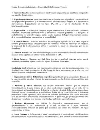 El documento describe la arterioesclerosis, en particular la ateroesclerosis. La ateroesclerosis se caracteriza por la presencia de placas ateromatosas en las arterias medias y grandes, compuestas de un núcleo lipídico rodeado por tejido fibroso. Se enumeran varios factores de riesgo como la edad, el sexo, los hábitos como fumar, y condiciones como la hipertensión y diabetes. Finalmente, se discuten varias teorías sobre la patogénesis de la ateroesclerosis, involucrando las células