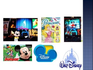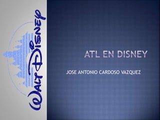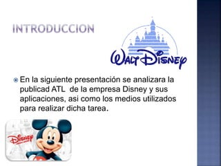 El documento analiza la publicidad ATL de Disney y los medios que utiliza, como la televisión, revistas, cine y anuncios en Times Square. Disney fue fundada en 1923 y ahora es una de las mayores corporaciones de comunicación y entretenimiento del mundo, con parques temáticos, canales de TV y estudios cinematográficos. Promueve sus productos a través de la televisión, su propio canal Disney Channel, revistas, espectaculares y radio.