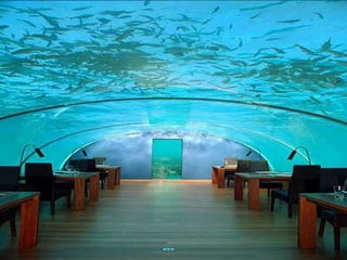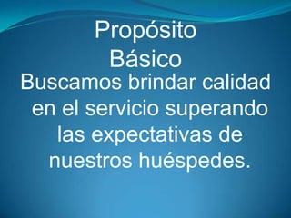Este documento presenta la misión y valores de un hotel marítimo, los cuales incluyen brindar un servicio de calidad que supere las expectativas de los huéspedes a través del profesionalismo y respeto, e innovación tecnológica. El hotel busca expandirse para convertirse en la principal cadena hotelera marítima en 15 años. Los huéspedes son recibidos en el puerto del hotel y llevados a sus habitaciones vidriadas con vista al ecosistema marino, donde encontrarán actividades y opciones de comida.