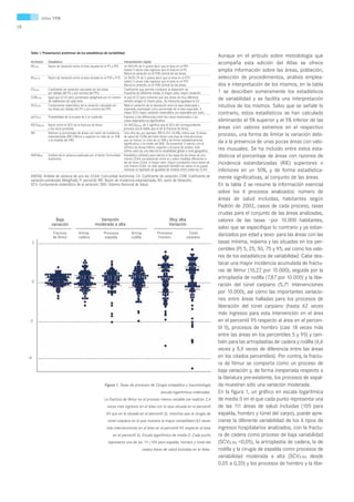 Este documento describe la variabilidad geográfica en 6 procedimientos de cirugía ortopédica y traumatología en España en 2002, incluyendo 89,444 casos. Se analizan las tasas y estadísticos de variabilidad para fractura de fémur, artroplastia de cadera, artroplastia de rodilla, cirugía de espalda, cirugía de hombro y liberación de túnel carpiano. Los resultados muestran baja variabilidad para fractura de fémur e variabilidad moderada a alta para los