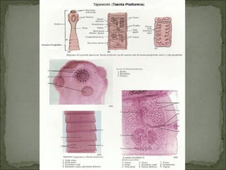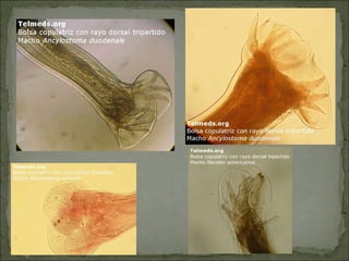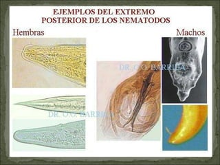 El documento proporciona información sobre las características generales de los nematodos. Menciona que son pseudocelomados, vermiformes y pequeños, con cutícula y solo músculo longitudinal. Describe que tienen boca con papilas, estiletes o mandíbulas, y faringe muscular. Finalmente, presenta imágenes de diferentes estructuras anatómicas de varios géneros de nematodos como Ascaris, Trichuris, Strongyloides y Ancylostoma.