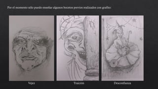 El documento describe un proyecto para crear un tarot sobre el miedo, con cartas que reflejen los miedos más profundos de las personas y que salgan de forma aleatoria para enfrentarse a ellos, numeradas del menor al peor miedo. Incluirá instrucciones y recomendaciones. Se muestran tres bocetos preliminares de cartas sobre vejez, traición y desconfianza.