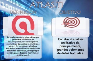 El documento describe Atlas.ti, un programa de análisis cualitativo de datos que facilita el análisis de grandes volúmenes de datos textuales. Atlas.ti ofrece varias herramientas para el usuario y utiliza formatos comunes para el acceso a la información. El programa permite organizar de manera planificable proyectos, tesis, actividades o análisis de forma accesible.