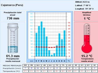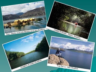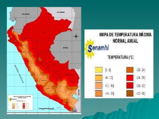 El documento presenta un resumen del relieve, clima, hidrografía y desastres naturales de Perú. Describe las principales cordilleras como los Andes, así como los valles de Vilcanota y Locum. Explica que Perú posee una gran diversidad de climas que incluyen la costa, sierra y selva. Presenta algunos de los principales ríos como el Marañón, Rímac y Santa. También menciona desastres naturales recientes como sismos, tsunamis, inundaciones y erupciones volcánicas.