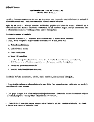 El documento propone un proyecto para que los estudiantes construyan de forma grupal un atlas que represente a un continente. Cada grupo deberá recopilar información sobre el continente asignado, incluyendo antecedentes históricos, características físicas, datos estadísticos, mapas físico y político, y análisis demográfico. Los grupos deberán diseñar el atlas en formato digital e impreso, y uno de los estudiantes expondrá las conclusiones sobre la realidad geográfica y socio-polí