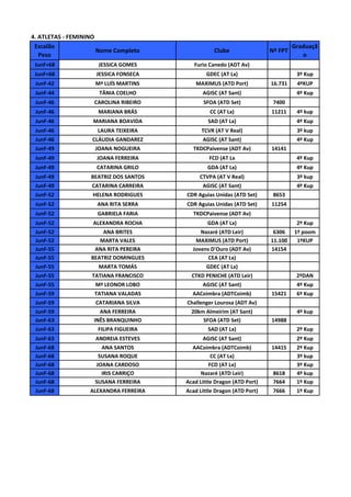 Este documento proporciona una lista de atletas femeninas clasificadas por peso. Se incluye el nombre, club, número de licencia de la Federación Portuguesa de Taekwondo y grado de cada atleta. Las atletas están organizadas en diferentes categorías de peso que van desde los -42 kg hasta los +68 kg.