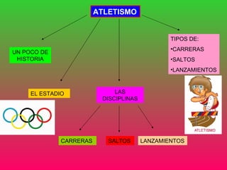 El documento resume la historia y las disciplinas del atletismo. Comenzó en los Juegos Olímpicos de la antigua Grecia y se reanudó en los Juegos Olímpicos Modernos de 1896. Las principales disciplinas son carreras, saltos y lanzamientos, cada una con diferentes variantes y reglas técnicas.