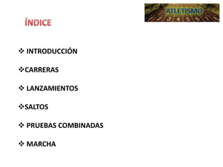 El documento resume las diferentes disciplinas del atletismo, incluyendo carreras como velocidad, medio fondo y campo a través, saltos como salto de altura y longitud, lanzamientos como peso, disco y martillo, y pruebas combinadas. También menciona algunos de los atletas más destacados en cada disciplina y los récords mundiales. El atletismo es uno de los deportes más antiguos practicados en los Juegos Olímpicos.