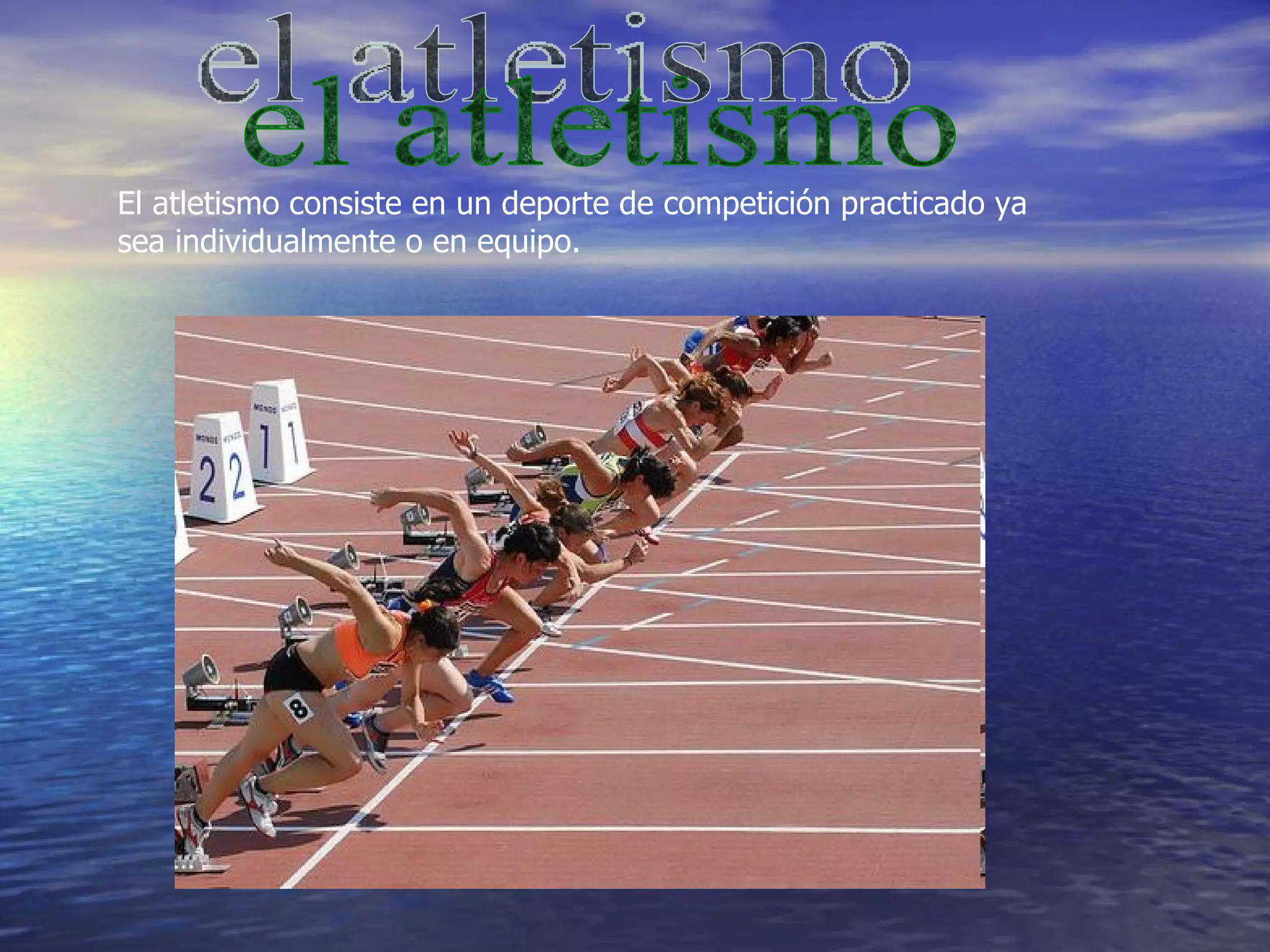 El atletismo es un deporte que consiste en carreras, saltos, lanzamientos, pruebas combinadas y marcha, practicado individualmente o en equipo, cuyo objetivo es superar el rendimiento de los adversarios en velocidad, resistencia, distancia o altura, y que fue practicado por primera vez por los griegos en los Juegos Olímpicos en el 776 AC.