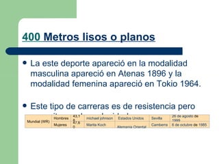 Este documento resume tres carreras de atletismo de medio y larga distancia: los 400 metros, 800 metros y 1500 metros lisos. Incluye los récords mundiales masculinos y femeninos de cada carrera con la fecha, lugar y atleta. Los 400 metros requieren mucha velocidad además de resistencia, mientras que los 800 y 1500 metros son pruebas de media y larga distancia respectivamente que han sido dominadas por diferentes atletas de acuerdo a su época.