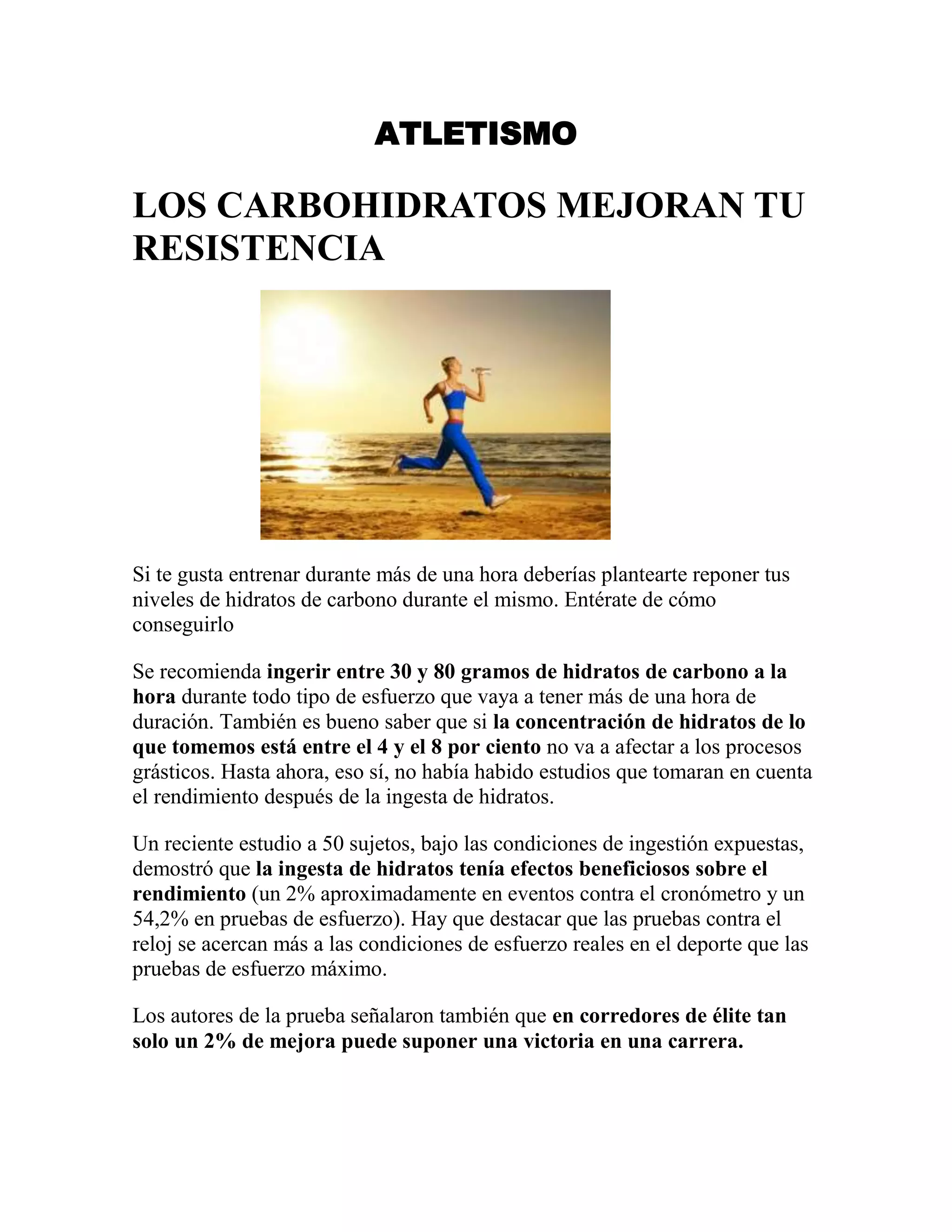 Este documento proporciona información sobre cómo la ingesta de carbohidratos durante el ejercicio de más de una hora puede mejorar la resistencia. Un estudio encontró que la ingesta de carbohidratos tuvo efectos beneficiosos sobre el rendimiento, con mejoras de hasta el 2% en pruebas contra el cronómetro y del 54,2% en pruebas de esfuerzo máximo. También ofrece consejos sobre cómo usar la carrera para quemar grasa de manera efectiva, incluyendo variar los ritmos de carrera y días de entrenamiento para ev