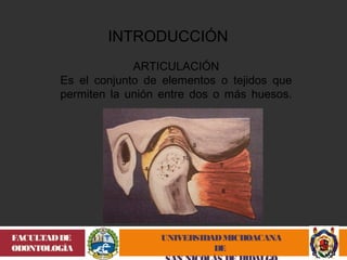 La Articulación Temporomandibular (ATM) es una de las articulaciones más complejas del cuerpo humano, uniendo la mandíbula al cráneo y permitiendo movimientos de masticación y habla. El documento describe la anatomía, estructuras, movimientos, irrigación e inervación de la ATM, concluyendo que es una articulación vital para funciones importantes como la alimentación y comunicación.