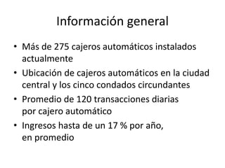 Woodgrove Bank actualmente tiene más de 275 cajeros automáticos instalados en la ciudad central y los cinco condados circundantes, que procesan un promedio de 120 transacciones diarias por cajero. El banco propone expandir su red de cajeros automáticos para aumentar los ingresos anuales de hasta un 17%. Las seis ubicaciones actuales más populares generan entre $802,000 y $1,700,000 en transacciones mensuales cada una.