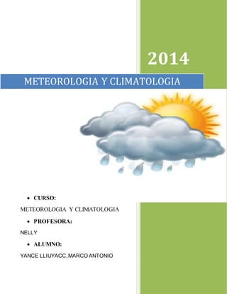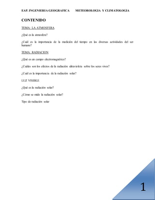 Este documento resume los conceptos clave de meteorología y climatología impartidos en un curso. Explica que la atmósfera está compuesta principalmente por nitrógeno, oxígeno y otros gases, y describe las cinco capas en que se divide. También destaca la importancia de medir el tiempo para la planificación humana y las actividades agrícolas. Resume los efectos dañinos de la radiación ultravioleta en la piel y ojos humanos, así como la importancia de la radiación solar en procesos como la fotosíntesis.