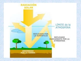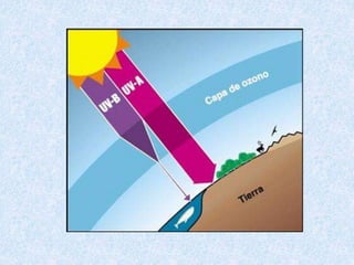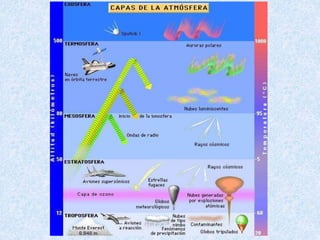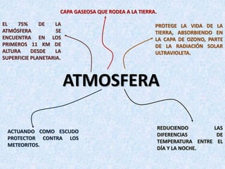 La atmósfera es la capa gaseosa que rodea a la Tierra y protege la vida al absorber la radiación ultravioleta dañina, reducir las diferencias de temperatura y actuar como escudo contra meteoritos. Se compone principalmente de nitrógeno, oxígeno y carbono y controla el clima y ambiente. Está dividida en la troposfera cercana a la superficie, donde ocurren los fenómenos climáticos, y la estratosfera, que contiene la capa de ozono protectora.