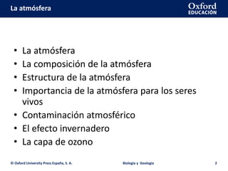 La atmósfera es la capa gaseosa que rodea la Tierra y contiene nitrógeno, oxígeno, vapor de agua y dióxido de carbono. Está dividida en varias capas y protege la vida al regular la temperatura y proporcionar gases necesarios. La contaminación atmosférica altera su composición y amenaza a los ecosistemas, mientras que el efecto invernadero y la destrucción de la capa de ozono tienen graves consecuencias climáticas.