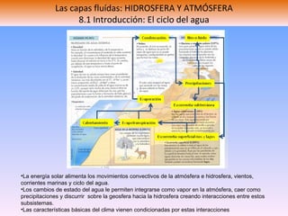 El documento describe los subsistemas terrestres de la hidrosfera y la atmósfera. La hidrosfera y la atmósfera son capas fluidas que interactúan a través del ciclo del agua, con la energía solar impulsando la convección en la atmósfera y la hidrosfera. La atmósfera tiene una estructura y composición que regulan la temperatura a través de gradientes verticales y la circulación general de vientos en tres celdas de convección. La hidrosfera distribuye el agua principalmente en los océanos y particip