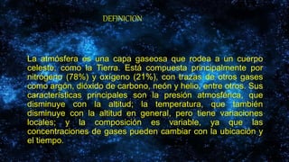 La atmósfera terrestre está compuesta principalmente por nitrógeno y oxígeno. Está dividida en cinco capas principales: la troposfera, la estratosfera, la mesosfera, la termosfera y la exosfera. Los tiempos atmosféricos se refieren a las condiciones meteorológicas en un momento dado, mientras que el clima se refiere a las condiciones promedio a largo plazo. Los tiempos atmosféricos y climas son útiles para predecir patrones meteorológicos y tomar decisiones
