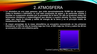 La atmósfera es una capa gaseosa que rodea la Tierra y está compuesta principalmente de nitrógeno, oxígeno y vapor de agua. Se divide en varias capas - la troposfera, la estratosfera, la mesosfera y la termosfera - donde la temperatura varía con la altitud. La atmósfera es fundamental para procesos climáticos y de soporte vital en la Tierra.