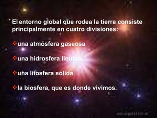 La atmósfera terrestre consiste principalmente en nitrógeno, oxígeno y pequeñas cantidades de otros gases. Se divide en cinco capas - la troposfera, la estratosfera, la mesosfera, la termosfera y la exosfera - cada una con características de temperatura únicas. La atmósfera es esencial para la vida en la Tierra ya que mantiene una temperatura adecuada, hace posible la respiración y la combustión, y protege de la radiación solar.
