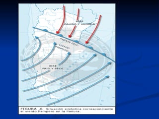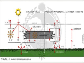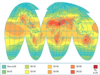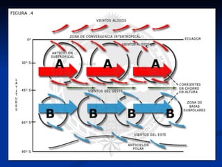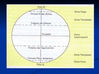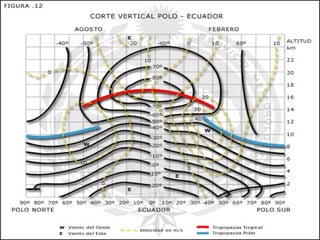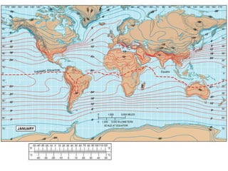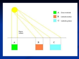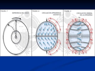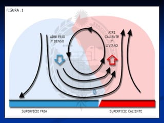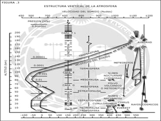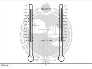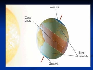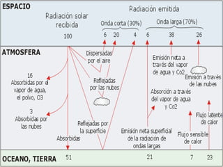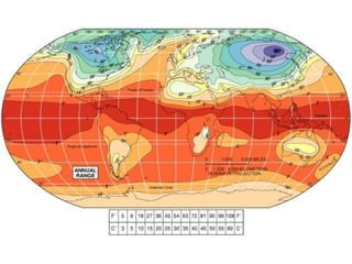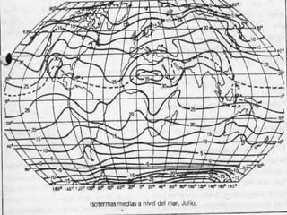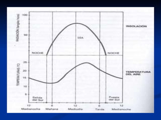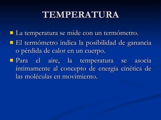 El documento habla sobre la temperatura, el calor y la atmósfera. Explica que la temperatura se mide con un termómetro y depende de la energía cinética de las moléculas. También describe las escalas Celsius y Fahrenheit, y cómo la temperatura varía diurna y estacionalmente debido a factores como la radiación solar, la latitud, y los tipos de superficie. Además, explica que la atmósfera está compuesta principalmente por nitrógeno, oxígeno y vapor de agua, y que sus movimientos transportan ag