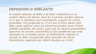 El modelo atómico de Bohr propuso que los electrones orbitan el núcleo en órbitas cuantizadas y estables, y que los electrones solo pueden cambiar de órbita absorbiendo o emitiendo fotones de energía igual a la diferencia de energía entre las órbitas. Bohr introdujo tres postulados: 1) los electrones se mueven en órbitas circulares sin emitir radiación, 2) solo ciertos radios de órbita son permitidos de acuerdo a la cuantización del momento angular, y 3) los camb