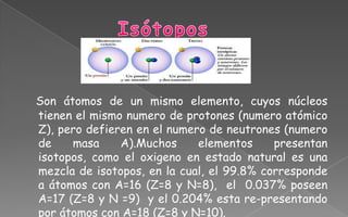 Los isotopos son átomos del mismo elemento que tienen el mismo número de protones pero diferente número de neutrones. El oxígeno está compuesto principalmente de dos isotopos, el oxígeno-16 y el oxígeno-18. Los isóbaros son átomos de diferentes elementos que tienen la misma masa atómica. El calcio y el argón comparten el isóbaro calcio-40 y argón-40.
