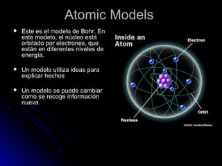 Este documento resume la historia de la teoría atómica desde Demócrito en el 400 AC hasta el modelo actual basado en la mecánica cuántica. Demócrito propuso la existencia de átomos indivisibles llamados "átomos", pero su teoría fue ignorada durante 2000 años. En el 1800, Dalton reintrodujo la idea de los átomos y propuso que los elementos químicos están compuestos de átomos únicos. Más tarde, experimentos mostraron que los átomos contenían partículas más pequeñas como electrones