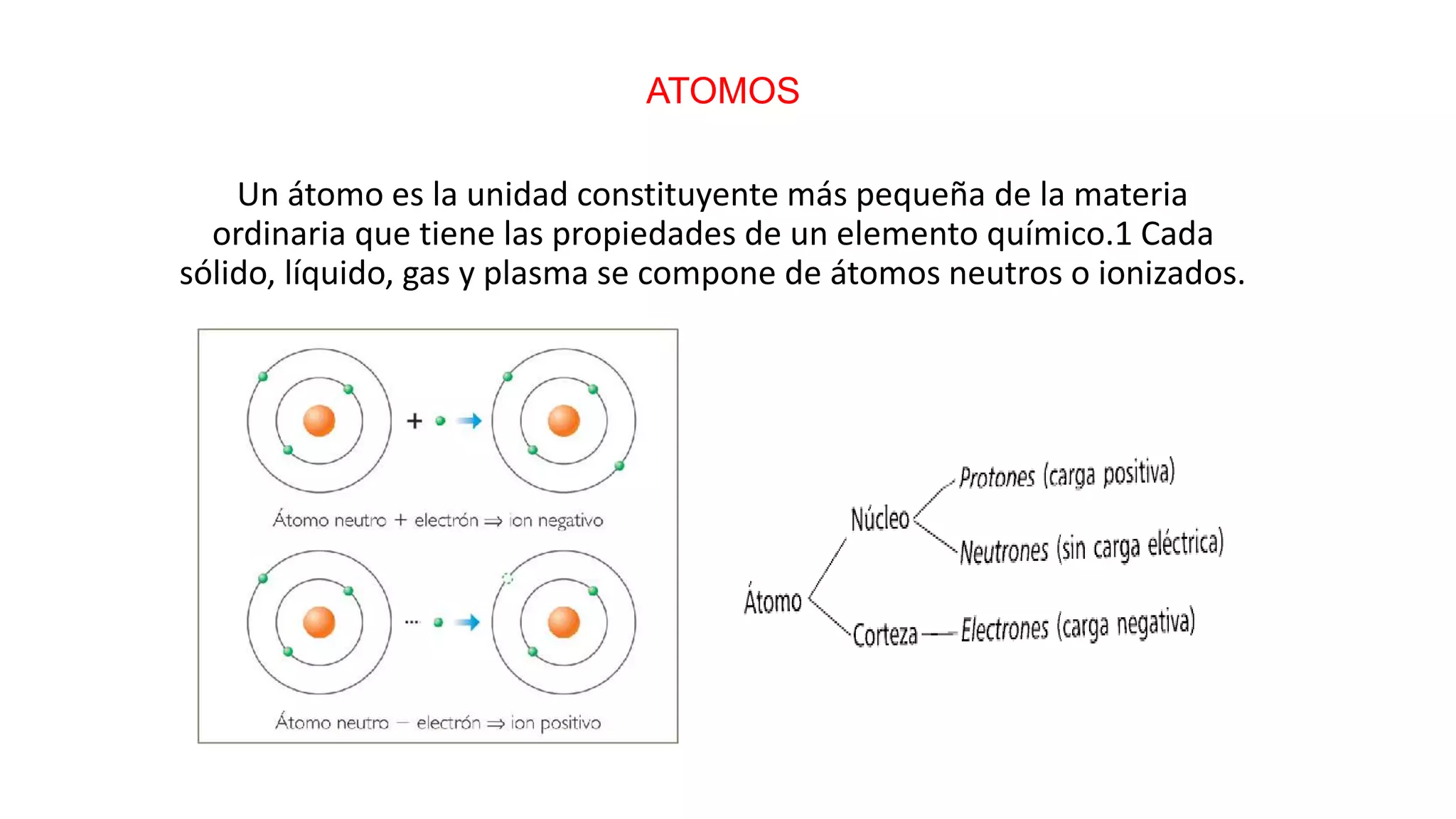 Un átomo es la unidad más pequeña de la materia que tiene las propiedades de un elemento químico. Los átomos son muy pequeños, alrededor de 100 pm de tamaño, y están compuestos de un núcleo central rodeado de electrones. Se han propuesto varios modelos atómicos a lo largo de la historia, incluyendo los modelos de Dalton, Thomson, Rutherford, Bohr y Sommerfeld.