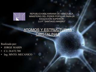 El documento describe las propiedades de los átomos y las estructuras cristalinas. Explica que los átomos están compuestos de protones, neutrones y electrones, y que han evolucionado desde conceptos filosóficos antiguos hasta modelos atómicos modernos. También describe las seis estructuras cristalinas principales y los tres tipos de cristales - iónicos, covalentes y metálicos - según el tipo de enlace atómico.