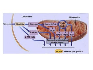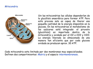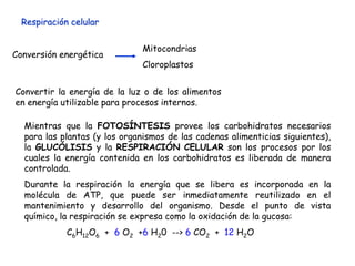 La respiración celular y la glucólisis son procesos mediante los cuales las células liberan energía de los carbohidratos de forma controlada. La glucólisis convierte la glucosa en piruvato en el citosol y la respiración celular oxida completamente el piruvato a dióxido de carbono en las mitocondrias, almacenando la energía en ATP. Las mitocondrias contienen membranas que permiten la fosforilación oxidativa, donde la energía de los electrones transportados a lo largo de la cadena respir