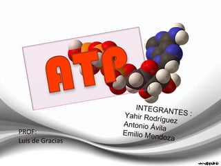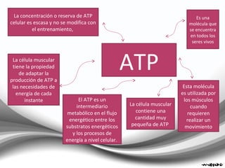 El documento describe la molécula de ATP (adenosín trifosfato), la principal fuente de energía en las células. El ATP almacena y transfiere energía química a través de la hidrólisis de los enlaces de alta energía de sus grupos fosfato. Las células musculares utilizan el ATP para generar movimiento a través de la contracción muscular. Aunque la cantidad de ATP en las células es pequeña, puede ser continuamente regenerado a través de la glucólisis y la cadena de transporte de electrones para satisfacer las neces