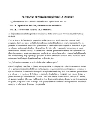 Este documento resume las preguntas de autorreflexión de la Unidad 2 de un curso sobre estadística descriptiva. El estudiante encontró más significativos los temas sobre organización de datos y distribución de frecuencias. Aprendió fórmulas en Excel, tipos de intervalos como clase y amplitud, y fronteras y marcas de clase. Ya conocía gráficas. Considera ventajosos los conceptos de estadística descriptiva para obtener una visión general sin conocimientos previos, como lo demuestra el ejemplo del vendedor