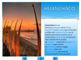 Este documento describe varios atractivos turísticos del Perú. Menciona que Huanchaco es un balneario histórico en la costa norte donde se originó el ceviche. También habla del Señor de Sipán, un antiguo gobernante descubierto en 1987 cuyo entierro intacto reveló detalles sobre las civilizaciones pre-incas. Finalmente, menciona sitios como Moray y Machu Picchu.