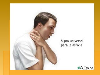 Este documento describe la anatomía de la traquea y la epiglotis, y cómo esta última protege la entrada de la traquea al cerrarse durante la deglución. Explica también las causas y síntomas de la asfixia por atragantamiento, así como las maniobras de Heimlich y reanimación para adultos, niños y bebés. Finalmente, proporciona medidas preventivas para evitar atragantamientos.
