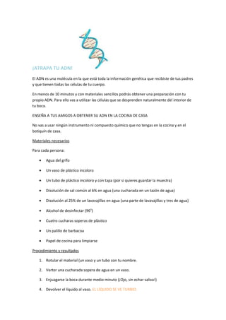 Este documento describe un procedimiento sencillo para aislar ADN a partir de células de la boca en la cocina de casa. Se necesitan materiales comunes como agua, sal, lavavajillas y alcohol para separar las hebras de ADN de las células bucales y observarlas flotando entre dos capas de líquido. Siguiendo los 11 pasos, los estudiantes pueden aislar su propio ADN y analizar los resultados para aprender sobre esta importante molécula genética.