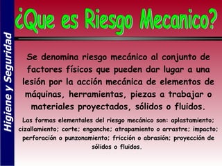 El documento describe los principales riesgos mecánicos en máquinas como aplastamiento, cizallamiento, corte, enganche, atrapamiento o arrastre, impacto, perforación o punzonamiento, fricción o abrasión y proyección de sólidos o fluidos. Explica que los atrapamientos son producidos por intervención manual en el punto de operación, aproximación al punto de operación, falla en la comunicación entre operarios, puesta en marcha inprevista de la máquina y desplazamiento de mesas o carros. Además