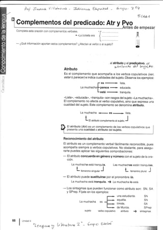 Este documento presenta los conceptos de atributo y predicativo, dos tipos de complementos verbales que afectan al sujeto de la oración. Explica que el atributo acompaña a verbos copulativos y expresa una cualidad del sujeto, mientras que el predicativo afecta tanto al sujeto como al verbo y puede omitirse sin que la oración pierda sentido. Además, señala las diferencias entre ambos complementos y ofrece ejemplos para reconocerlos.